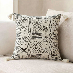 Front of these boho throw pillows are made from 100% cream cotton. Mudcloth fabric with black stencil detailing. Hand-spun cotton threads are hand-woven using narrow wooden looms into strips of cloth. The cloths are hand-dyed in small vats using local flora and fermented earth from the Niger riverbed.