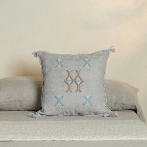 Our Moroccan cactus silk pillow covers are hand woven by skilled artisans on traditional wooden looms, a craft that has been handed down for generations over many centuries. Following our own design, the motifs on the pillow cover reflect traditional symbols used by tribal women from Morocco's Atlas Mountains. After weaving, the artisans will sow on an interlaced braiding on all four sides featuring a playful tassel on each corner. The Sabra pillow case is then washed and dried in the sun to achieve its unique, burnished character.