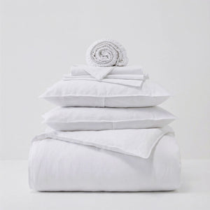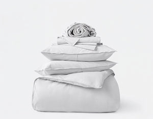 King - Fitted Sheet (80”L x 76”W x 15”D), Flat Sheet (110”L x 104”W), King Pillowcases (20”L x 37”W), Duvet Cover (107"L x 90"W)