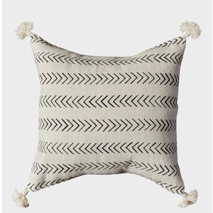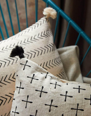 Front of these boho throw pillows are made from 100% cream cotton. Mudcloth fabric with black stencil detailing. Hand-spun cotton threads are hand-woven using narrow wooden looms into strips of cloth. The cloths are hand-dyed in small vats using local flora and fermented earth from the Niger riverbed.